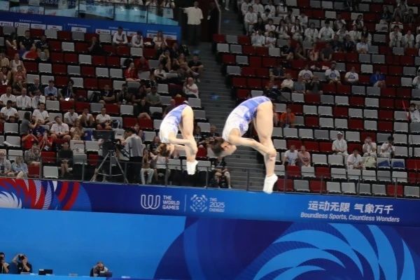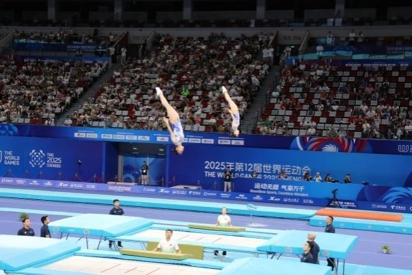 2025年成都世运会蹦床项目下设双人同步、单跳和双蹦床3个小项,赛程3天,共计64名运动员参赛。双人同步项目是指两名运动员在两张平行摆放的蹦床上,同时完成相同的成套动作,对完成动作的难度、基本姿态、双人动作的一致性等有较高的要求。
